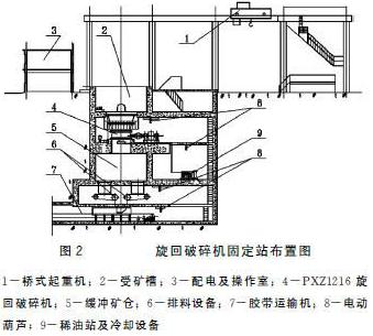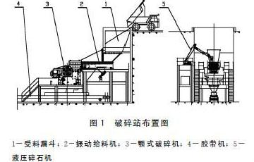 國內以旋回破碎機作為主機的破碎站大都是固定破碎站,國外同類產品中雖有相近能力的半移動破碎站,因為價格或者其他因素,在國內應用較少。所以以固定式破碎站作為比較對象,其配置如圖2。
